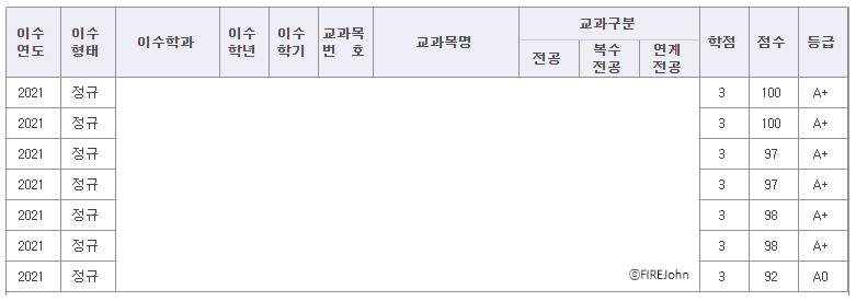 다들 공부를 열심히 하는 분들만 계신 것 같습니다. 장학금 경쟁이 이렇게 치열할 줄은 몰랐네요. 과제물보다는 시험이 아무래도 제한 시간이 있고 한학기 전체 범위를 공부해야 되다보니 전과목A+이 아니어도 장학금 받을수 있었던 것 같습니다.