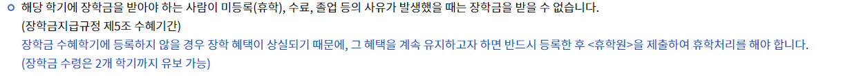 성적 우수 장학금을 받기 위해서는 성적은 당연히 잘 나와야 하고, 1) 직전 학기 18학점(약 6과목) 이상 이수 2) 학년 그룹별 학점을 충족 3) 다음 학기 등록자 의 조건도 만족해야 합니다. 저는 해보지는 않았지만 다음 학기 등록을 하지 않을 경우 휴학원을 제출하면 유보가능하다고 합니다.