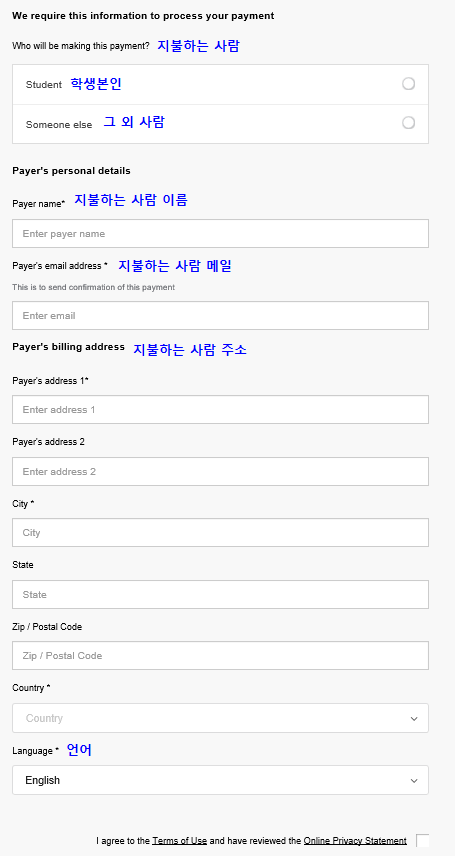 3단계에서는 실제 결제하는 사람의 정보를 확인합니다. 저는 제가 직접 납부하지만, 학생 외 다른 사람(예를 들면 부모님 혹은 대리인)이 할 수도 있기 때문인 것 같습니다. 아래 정보를 입력하고 다음을 누르면 됩니다.