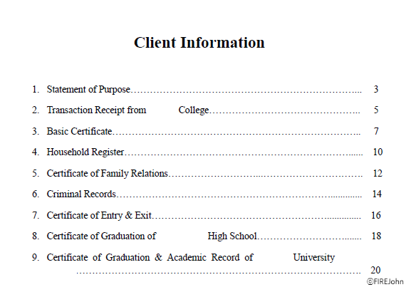 표지와 목차 만들기는 저도 학생비자 준비하면서 다른 분의 후기를 보고 따라서 적용하였습니다. 어떤 방식으로 검토하는지는 모르겠지만 제가 심사관의 입장이라고 생각하면 서류 뭉텅이로 받을 때보다 표지와 목차가 정리되어 있으면 한결 편할 것 같았습니다. 워드 파일에 아래와 같이 목차를 만들었습니다.