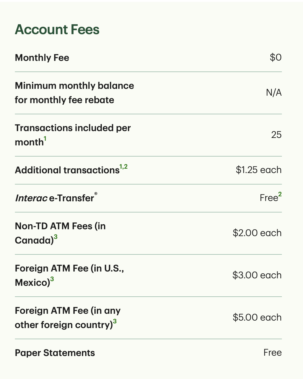 - 무료 거래 횟수: (E-transfer 포함하여) 1달에 25번, 이후 1회당 $1.25
