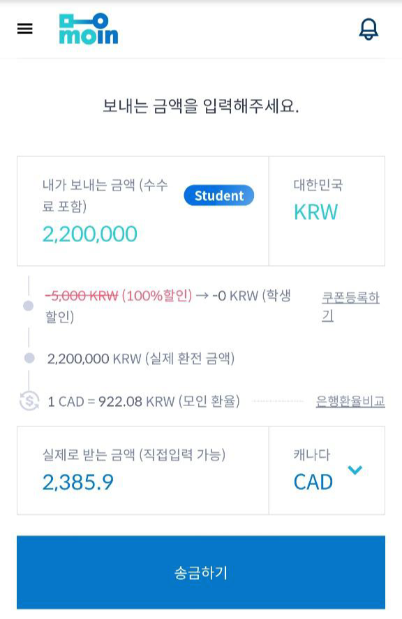 해외 송금할 때 가장 신경쓰이는 것은 수수료입니다. 카카오뱅크도 보고, 다른 여러 서비스를 살펴보다가 학생 할인으로 무려 수수료가 0인 모인(moin)을 발견하였습니다.